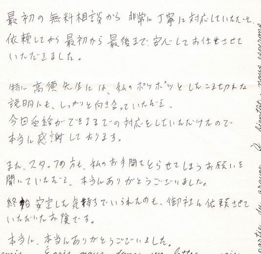 終始安定した気持ちでいられたのも、御社に依頼させていただいたお蔭です。