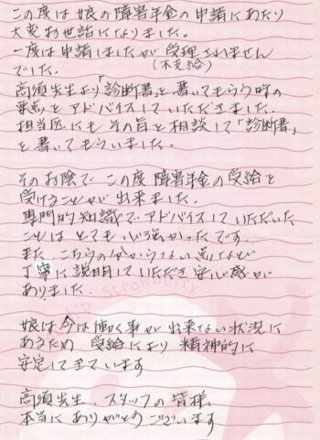 この度は娘の障害年金の申請にあたり大変お世話になりました。