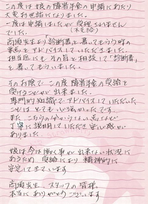特に髙須先生には、私のポツポツとしたこま切れな説明にも、しっかりと向き合っていただき、今回受給ができるまでの対応をしていただけたので、本当に感謝しております。
