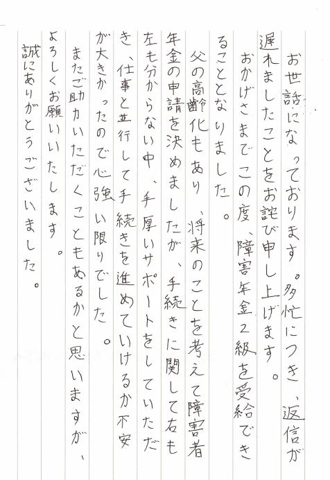 又、障害年金の更新の時にそちらにお世話になると思いますが、その時はよろしくお願いします。