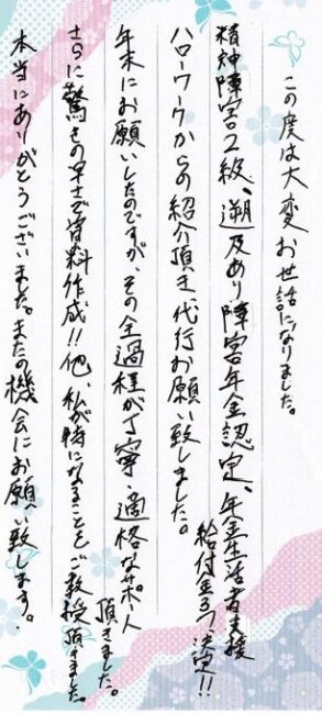 その後、障害厚生年金2級を受給でき、生活にも心にも余裕ができ、本当に感謝しております。