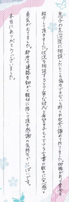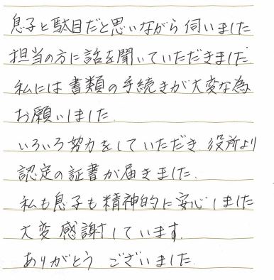 私も息子も精神的に安心しました。大変感謝しています。ありがとうございました。