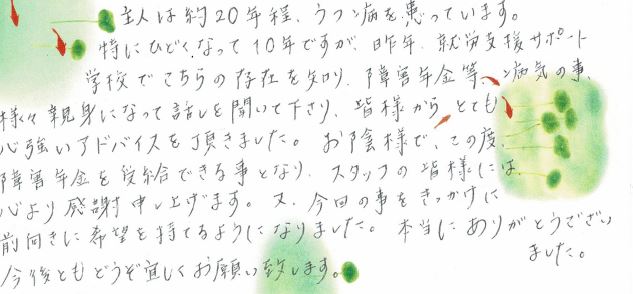 主人は約20年程、うつ病を患っています。特にひどくなって10年ですが、昨年、就労支援サポート学校でこちらの存在を知り、障害年金等、病気の事、様々親身になって話しを聞いて下さり、皆様からとても心強いアドバイスを頂きました。お蔭様で、この度、障害年金を受給できる事となり、スタッフの皆様には、心より感謝申し上げます。又、今回の事をきっかけに前向きに希望を持てるようになりました。本当にありがとうございました。今後ともどうぞ宜しくお願い致します。