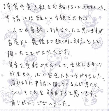 お蔭様で障害年金基礎年金2級を受給する事ができ本当にありがとうございました。