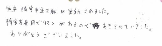 今回、障害年金の更新が決まり、とてもうれしく思っています。まさか3ヶ月で決まるとは思っていませんでしたし、4年間も年金がもらえてとてもうれしいです。