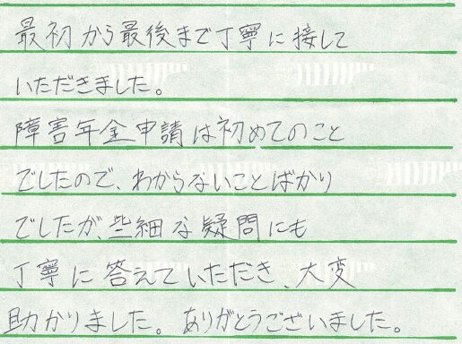 障害年金申請は初めてのことでしたので、わからないことばかりでしたが、些細な疑問にも丁寧に答えていただき、大変助かりました。ありがとうございました。