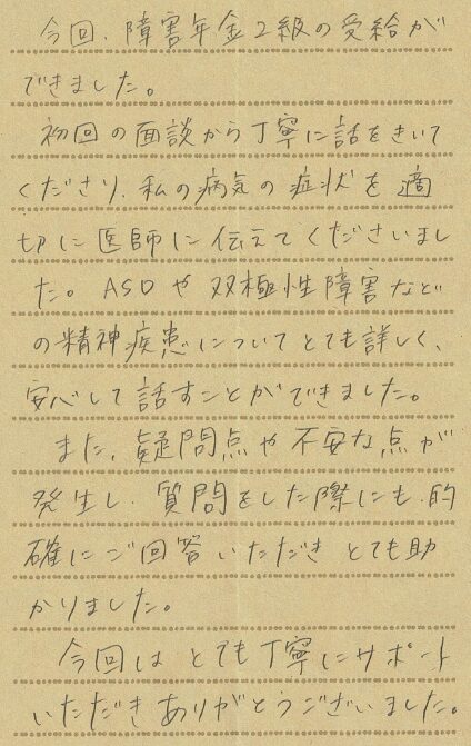 (スタッフより)                                                                             この度はお手紙をいただきありがとうございました。受給が決まり私共も大変うれしく思っております。今後も日常生活や就労に支障がある方に寄り添いサポートをしていきたいと思います。