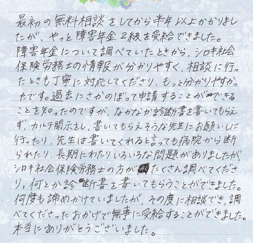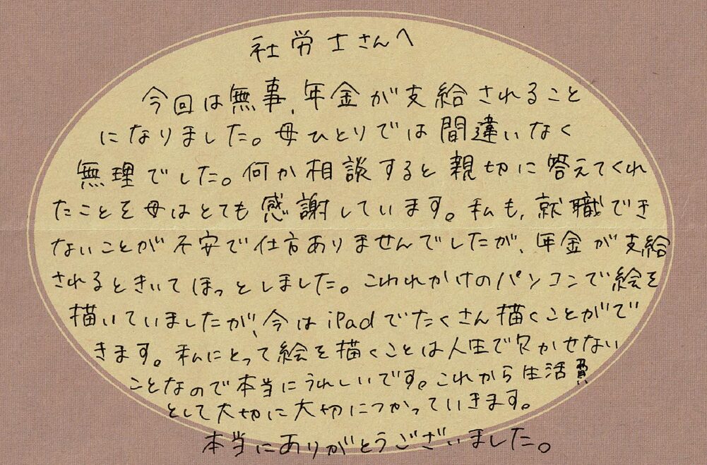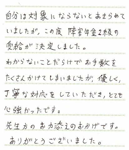 (スタッフより)                                                              この度はお手紙をいただきありがとうございました。時間が掛かってしまいましたが、受給が決まり私共も大変うれしく思っております。今後も困った時に何でも話していただけるような、ご依頼者様に寄り添ったサポートを心掛けてまいります。