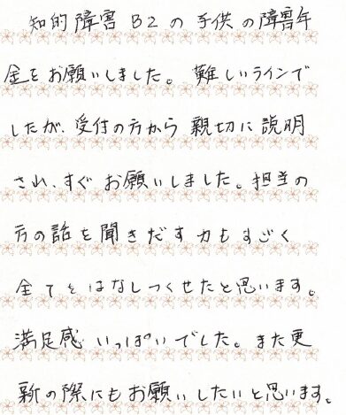 知的障害B2の子供の障害年金をお願いしました。難しいラインでしたが、受付の方から親切に説明され、すぐお願いしました。担当の方の話を聞きだす力もすごく全てをはなしつくせたと思います。満足感いっぱいでした。また更新の際にもお願いしたいと思います。