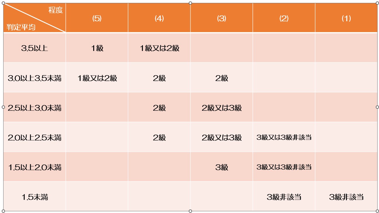 その組み合わせを「精神の障害に係る等級判定ガイドライン」の等級目安表に照らすと、概ねの等級の目安がわかります。                                                (目安と異なる等級になることもあります)