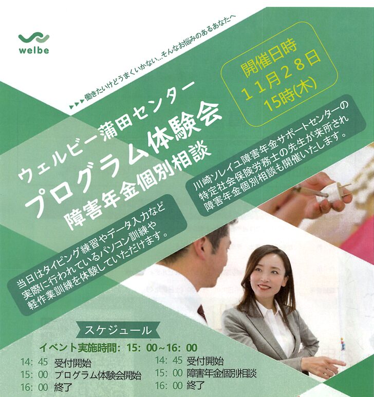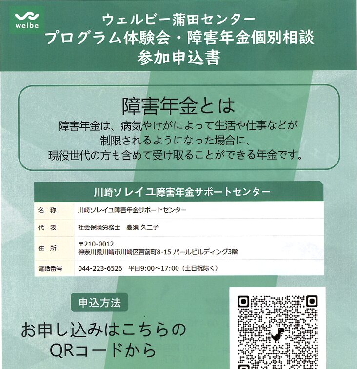 2024.11.29セミナー障害年金個別相談会を開催しました障害年金個別相談会ウェルビー 蒲田センター 様 「プログラム体験会-障害年金個別相談」【日時】 令和6年11月28日(木曜日) 15時00分~17時30分までウェルビー蒲田センターにて障害年金の個別相談会をさせていただきました。個別相談会に参加した方から、 ・相談してよかったと等のお声をいただきました。 また機会があれば、ぜひ個別相談会を開催したいと思っています。